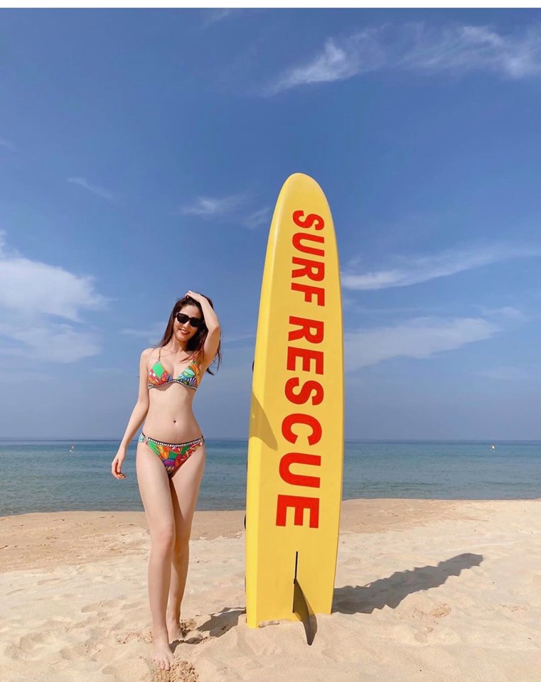 Góc nghiêng và cận đẹp như chụp hình tạp chí của Diễm My 9x. Set đồ bơi rực rỡ sắc màu khiến cô thêm nổi bật hơn và như níu kéo chút nắng thu trước khi trời chuyển lạnh. Để có được vóc dáng nuột nà như này, Diễm My 9x thường xuyên luyện tập thể thao và đặc biệt cô dùng thạch giảm cân khi quá bận rộn với lịch trình làm việc.