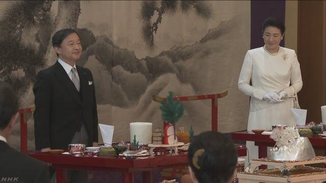 Người đứng đầu hoàng gia Nhật Bản cho biết ông cảm thấy rất vui mừng khi được tiếp đón các vị khách cho bữa tiệc chiêu đãi sau khi thực hiện nghi thức dùng bữa tối với nữ thần mặt trời. Nhật hoàng cũng cầu nguyện hạnh phúc cho người dân và sự phát triển không ngừng của đất nước.