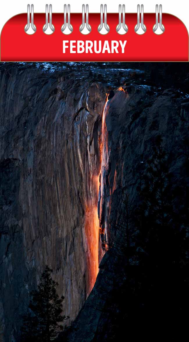 Công viên quốc gia Yosemite có một cảnh tượng đặc biệt thường xuất hiện vào tháng 2. Lúc này các tia sáng của mặt trời tạo góc phù hợp khiến ánh nắng hắt vào thác nước Horsetail Fall rực sáng như một thác lửa.