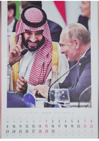 Ông trò chuyện với Tổng thống Ai Cập Abdel Fatah al-Sissi trong chiếc limo của mình trong tờ lịch tháng 10 và sau đó mỉm cười bên cạnh Thái tử Ả Rập Saudi Mohammed bin Salman trên tờ lịch tháng 11.