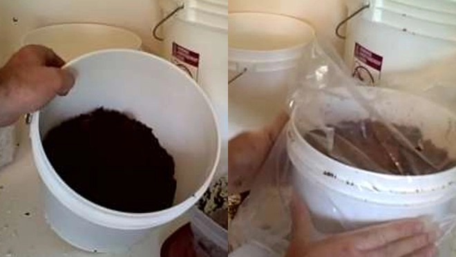 - Đổ chỗ bà cà phê vào trong thùng nhựa đã chuẩn bị từ trước. Nếu thấy khô, bạn có thể tưới thêm chút nước sao cho giá thể vừa đủ ẩm, không tưới quá nhiều tránh ứ đọng.