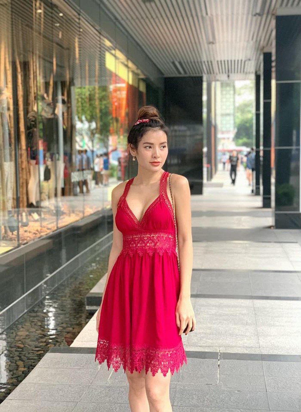 Cô nàng thu hút sự chú ý khi mặc chiếc váy có họa tiết ren gợi cảm trông như váy ngủ.
