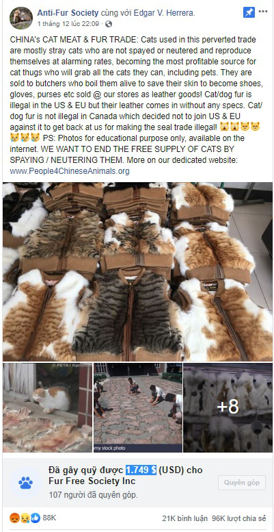 Theo một bài đăng trên Facebook của Fur-Free Society hay Anti-Fur Society thì những con vật đáng yêu sau khi rơi vào tay kẻ săn hoặc bắt trộm sẽ bị bán cho các lò mổ. Tại đây, chúng sẽ phải chịu cái chết đau đớn tột cùng: bị luộc sống. Bởi lẽ, chỉ có như vậy, bộ lông mượt mà mới được giữ nguyên vẹn, hoàn hảo để làm giày, găng tay, ví, hay thậm chí làm áo khoác. Tại Mỹ và Châu Âu, lông và da chó mèo là sản phẩm bất hợp pháp. Thế nhưng bằng cách nào đó da của chúng vẫn tuồn vào được hai thị trường này một cách kỳ lạ, trang này nói thêm.