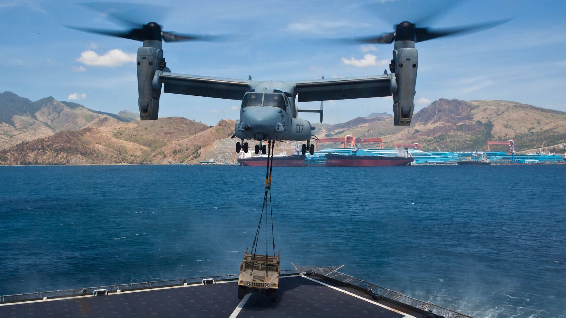 Máy bay MV-22B Osprey của Thủy quân Lục chiến Mỹ chuyển xe quân sự Humvee từ tàu tại vịnh Subic, Philippines. (Ảnh: Thủy quân Lục chiến Mỹ)