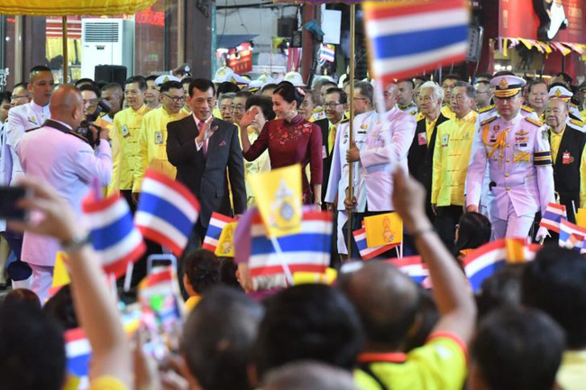 Hoàng hậu Suthida và chồng đi dọc một con phố nơi người dân đứng đợi chờ hai bên đường.