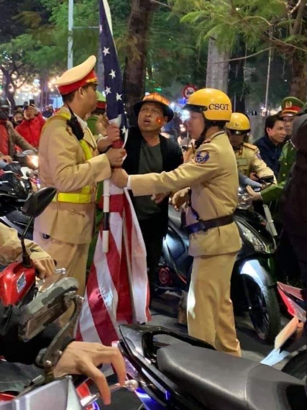 ông đó khùng, tự nhiên xách cờ Mỹ chi vậy, có liên quan gì đâu