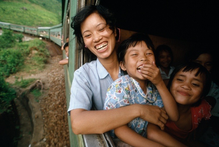 Cô gái Việt và đám trẻ vui đùa trên tàu Thống Nhất. Ảnh: Catherine Karnow.