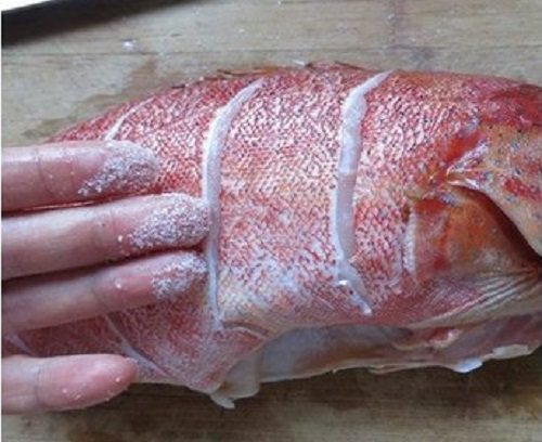 - Bước 1: Cá mổ và rửa sạch, dùng dao khứa 2 bên mặt thân cá là 4 đường có khoảng cách đều nhau. Sau đó xát đều muối lên vết khứa. Tiếp tục, xát rượu lên toàn bộ thân cá để khử mùi tanh.
