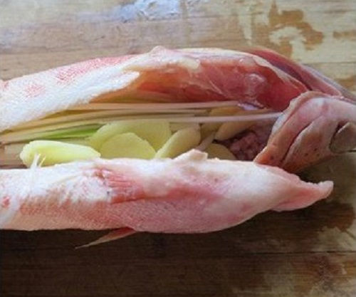 - Bước 2: Phần trắng của hành lá thái chỉ. Gừng 1 nửa đem thái lát, 1 nửa đem thái chỉ. Nhét một nửa hành lá và gừng vào bụng cá.