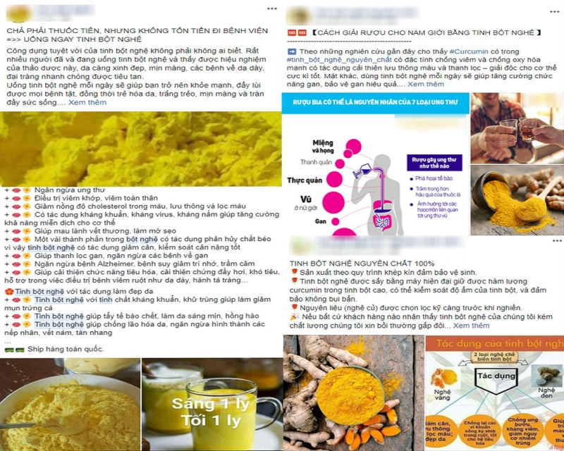 Có cung ắt có cầu, nắm được tâm lý của khách hàng, rất nhiều đối tượng đã kinh doanh loại thực phẩm này. Đầy rẫy trên mạng xã hội các tin cung cấp bột nghệ sỉ và lẻ với những lời quảng cáo có cánh về chất lượng cũng như công dụng thần kỳ của bột nghệ, khiến nhiều người càng tin rằng, uống nhiều bột nghệ vừa trị được bệnh vừa tốt cho sức khỏe.
