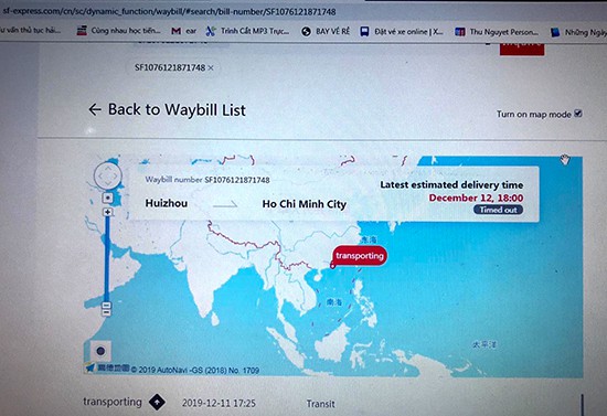 Theo đó, ngày 4/12, công ty này mua hàng ở Trung Quốc và được vận chuyển bởi Công ty TNHH SF Express từ Quảng Đông (Trung Quốc). Đơn hàng tới TP.Hồ Chí Minh vào ngày 6/12, đến ngày 12/12 thì làm thủ tục hải quan và nhận hàng.