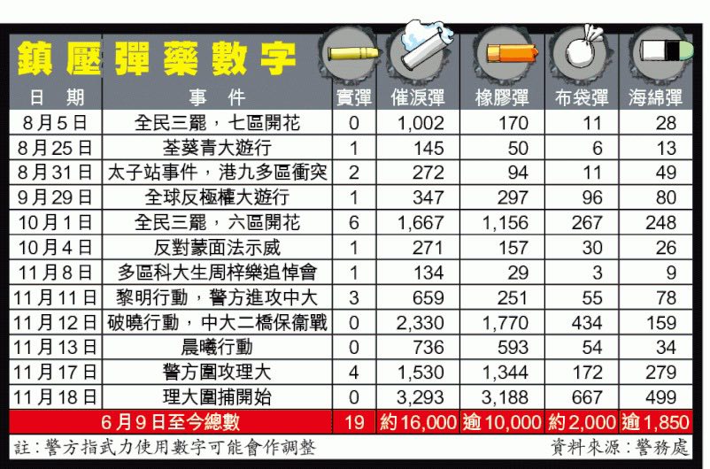 Từ ngày 6/9 đến ngày 9/12, trong phong trào đấu tranh tại Hồng Kông này, phía cảnh sát đã bắn tổng cộng 16.000 quả lựu đạn hơi cay, khoảng 10.000 viên đạn cao su, khoảng 2.000 viên đạn túi vải và khoảng 1.850 viên đạn bọt biển.