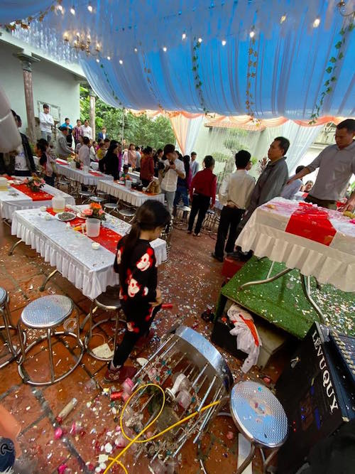 Cụ thể hơn, V.T hất rượu xuống sàn, đập ly rồi đạp đổ bánh kem cùng tháp rượu chứa champagne trước sự chứng kiến của quan viên hai họ và khách dự tiệc cưới.