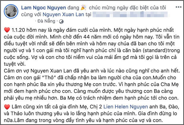 "1/1/2020 - hôm nay là ngày đám cưới của mình. Một ngày hạnh phúc nhất của cuộc đời mình. Mình chờ đến 44 năm mới có ngày hôm nay. Tôi vẫn tin điều tuyệt vời nhất sẽ đến bên mình và hôm nay chúa đã ban cho tôi một người vợ và 1 con gái mà tôi nghĩ hạnh phúc chỉ là căn bản trong cuộc sống. Vợ và con cho tôi niềm vui của mái ấm gia đình mà tôi gọi là trên cả tuyệt vời.