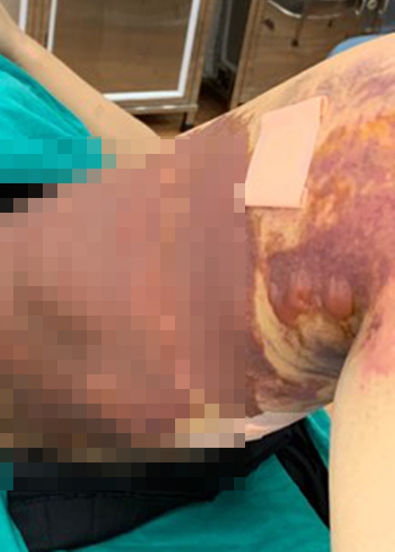 Bệnh nhân 28 tuổi bị hoại tử thượng bì da mặt trong hai đùi sau khi hút mỡ. Ảnh: BSCC.