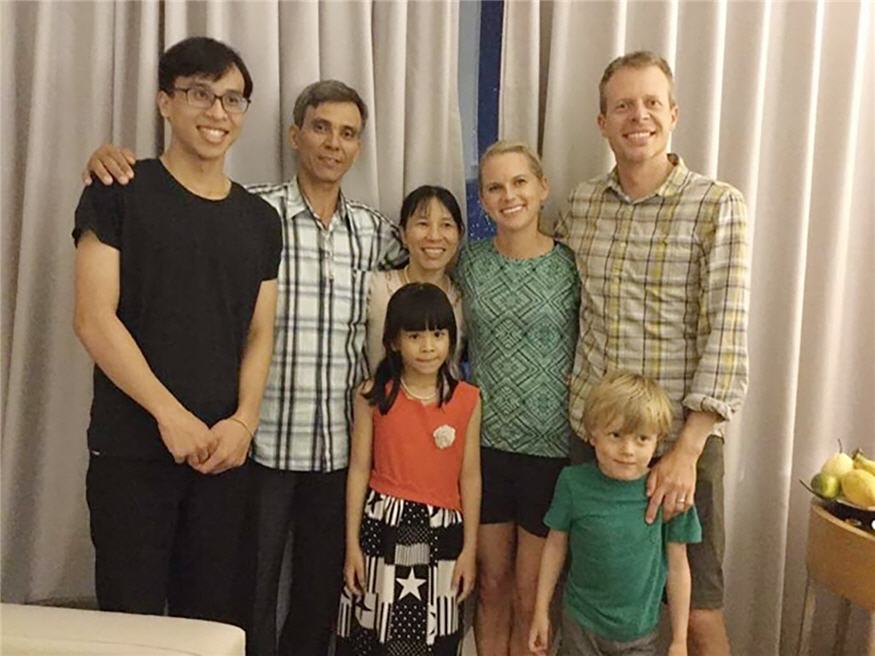 Cha ông Trần Quang Hùng và mẹ kế chụp hình cùng vợ chồng ông Hùng (giữa) tại Việt Nam. (Hình: Quang Viên)