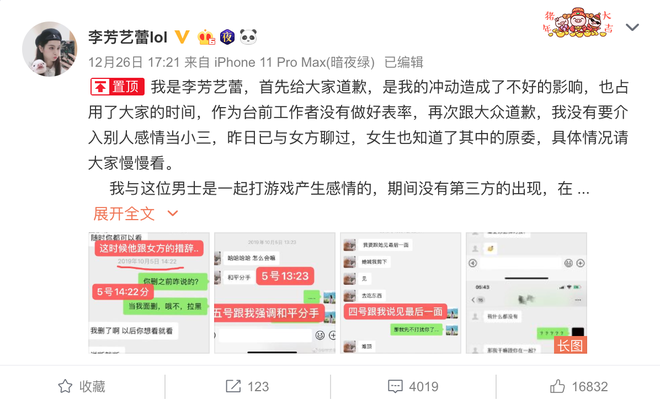 Được biết, Lý Phương Nghệ Luy có mối quan hệ với một người đàn ông đã có bạn gái và đoạn clip "mây mưa" của hai người bị lộ đã gây ra một phen xáo động trên mạng xã hội. Lý Phương Nghệ Luy sau đó đã lên tiếng giải thích trên Weibo cá nhân của mình, cô cho biết (lược dịch):