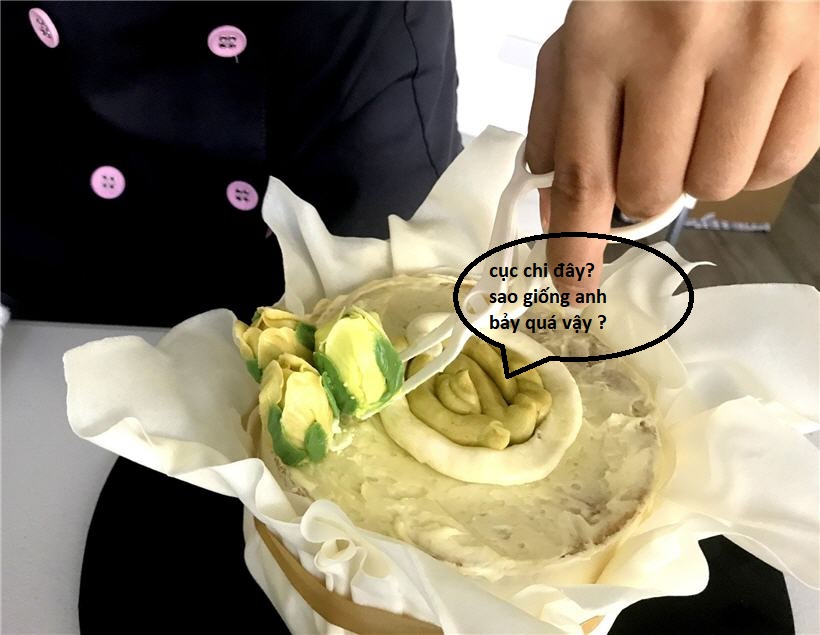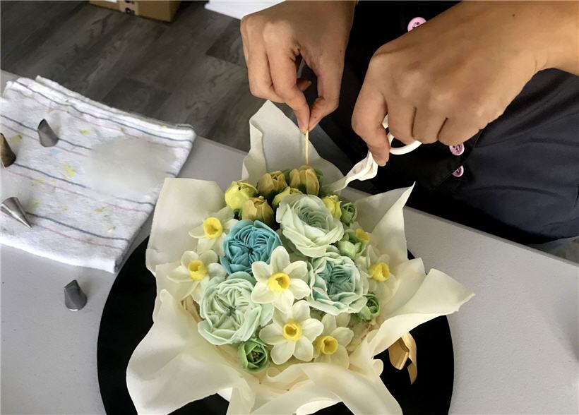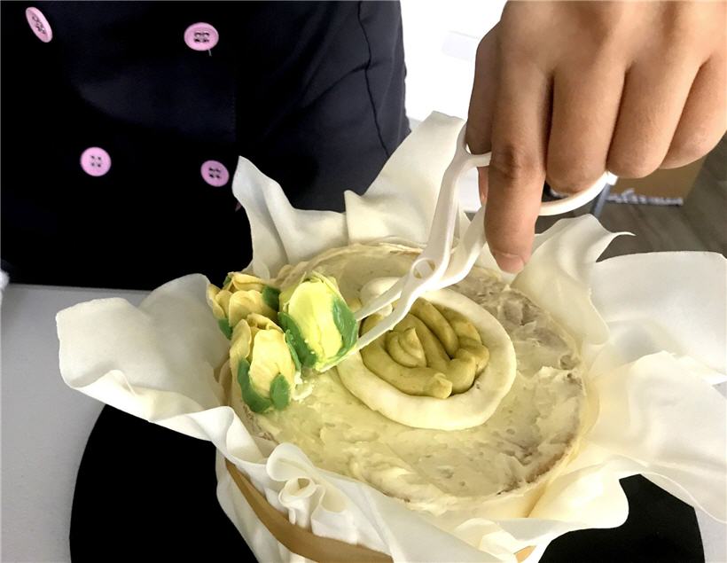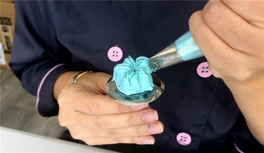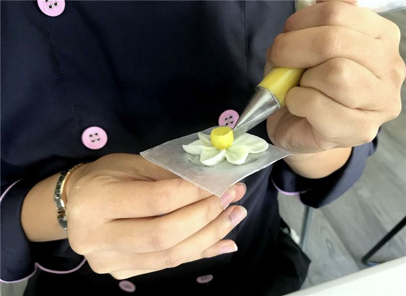 Chi tiết việc tạo hình một bông hoa bằng kem bơ. (Hình: Tâm An/Người Việt)