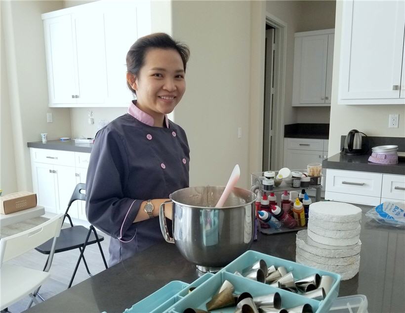 “Lúc đầu tôi học làm cho vui, nhưng vì nhà không có ai ăn nên tôi bắt đầu làm để bán. Từ khi có con nhỏ tôi nghỉ việc ở nhà chăm sóc con và nhận thấy ở Mỹ không có nhiều nơi dạy về cái này. Thế nên khi thấy nhiều người muốn học, tôi mở lớp dạy tại nhà và làm bánh theo đơn đặt hàng.”
