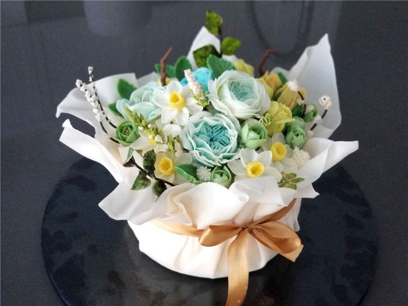 Ngay cả giấy gói cũng bằng một loại bột gạo tráng mỏng của bó hoa đẹp hút hồn với những cành hoa dại xen lẫn với những bông hồng leo, thủy tiên, tulip sống động mượt mà. Tất cả đều ăn được, ít ai có thể ngờ được rằng đó là một chiếc bánh kem có thể ăn được mọi thứ.