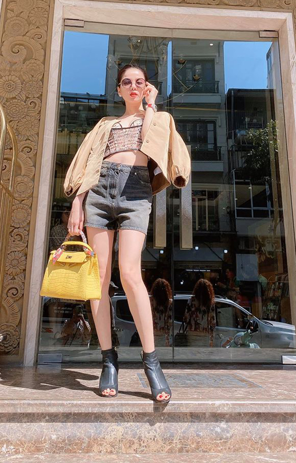 Lệ Quyên có vẻ mê mệt item thời trang này khi hầu hết trang phục đời thường của cô là áo croptop.