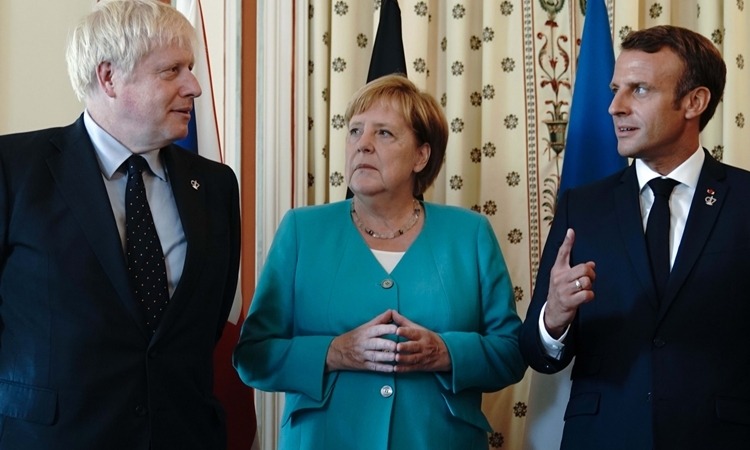 Từ trái qua phải: Thủ tướng Anh Boris Johnson, Thủ tướng Đức Angela Merkel và Tổng thống Pháp Emmanuel Macron dự hội nghị thượng đỉnh G7 ở Pháp hồi tháng 8 năm ngoái. Ảnh: Reuters.