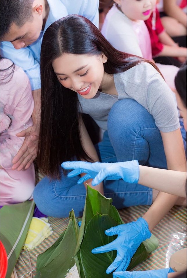 Hoa hậu Trần Tiểu Vy diện sét đồ giản dị gồm quần jeans và áo phông ngồi gói bánh chưng. "Mọi khi mình đã sẵn sàng đón Tết trước 1 tháng. Sao nay còn 5 ngày nữa là Tết mà mông lung ghê, chưa chuẩn bị gì hết", người đẹp "than thở".