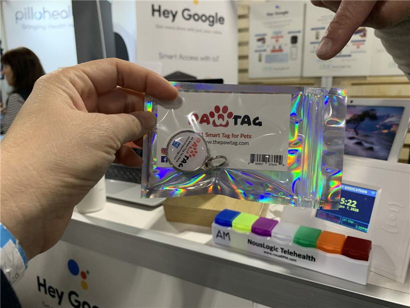 Máy gắn theo dõi vị trí của động vật trong nhà và hộp thuốc thông minh của Nouslogic. (Hình: Titi Mary Trần/Người Việt)