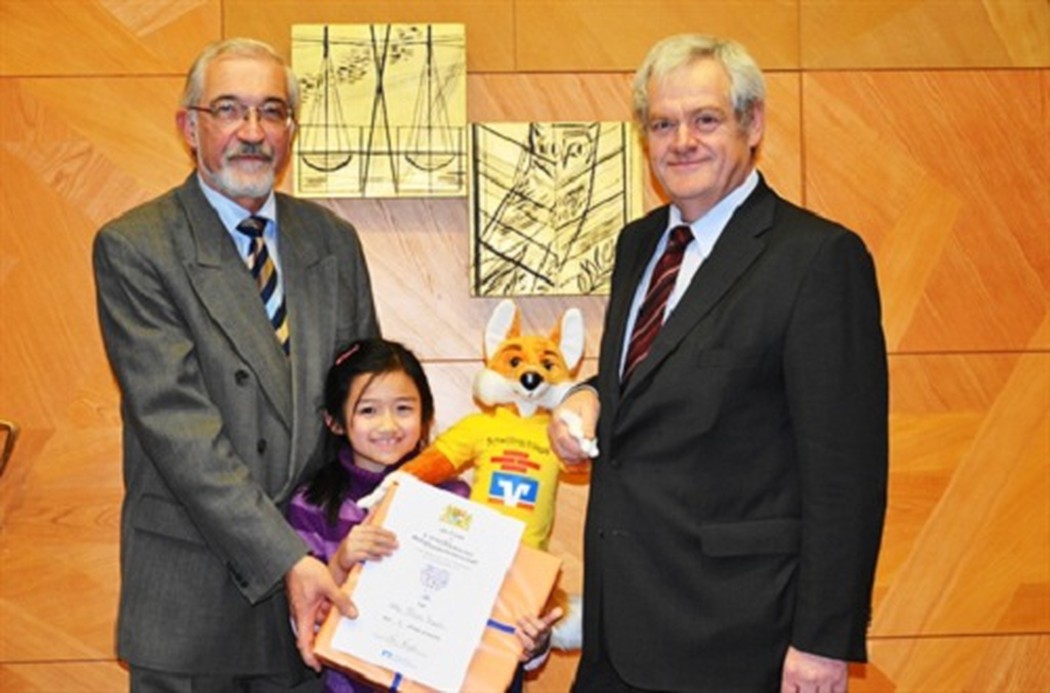 Thanh Mai 7 tuổi đạt giải vô địch toán tỉnh Unterfranken. Trong ảnh là Chủ tịch tỉnh Unterfranken Dr. P. Beinhofer và Chủ tịch nhà Bank, Bezirkspräsident K. Hippeli, RV Bank, nhà tài trợ cho cuộc thi.