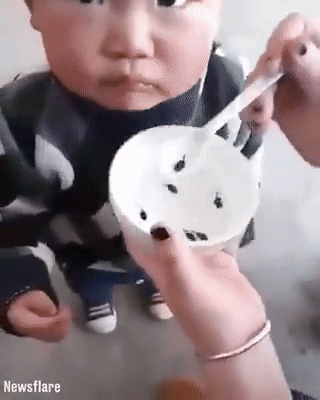 Còn đây là đoạn clip chú bé được người lớn đút cho ăn nòng nọc. Đứa trẻ còn quá nhỏ để biết được rằng mình vừa nuốt thứ gì vào miệng.