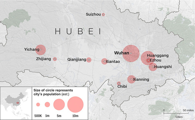 11 thành phố bị phong tỏa đi lại ở tỉnh Hồ Bắc để ngăn virus corona lây lan. Đồ họa: Maps4news.com.