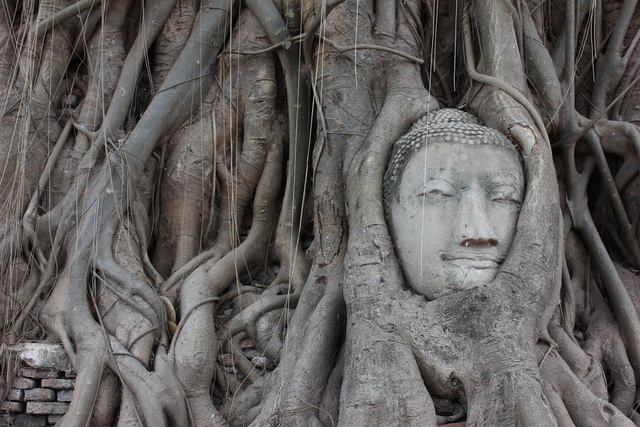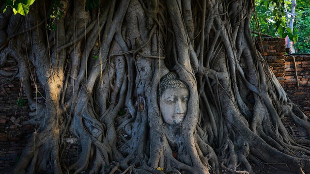 Đầu tượng Phật ẩn trong bộ rễ cây chằng chịt, trong khuôn viên chùa Wat Mahathat