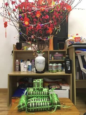 Lưu học sinh đón Tết cổ truyền với bánh tét, cành đào. Ảnh: Nguyễn Thị Hiển