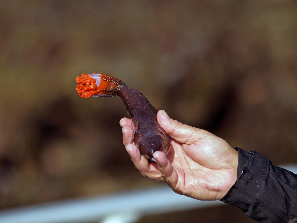 Dưa chuột biển ở Alaska:Thủ thuật để chế biến thành công món ăn này là tách và cạo phần bên trong dưa chuột biển, sau đó dùng thìa để bóc thịt thịt ra khỏi lớp xương cứng. Chúng được đảo qua một vài phút trong chảo và nêm nếm thêm nước tương. Món ăn có vị giống rau diếp; giòn và đậm đà.