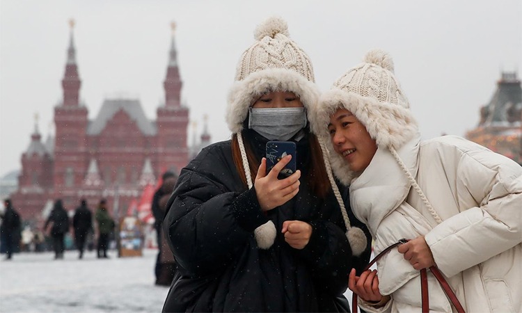 Du khách đeo khẩu trang chụp ảnh trên Quảng trường Đỏ, Moskva, Nga ngày 28/1. Ảnh: Reuters.