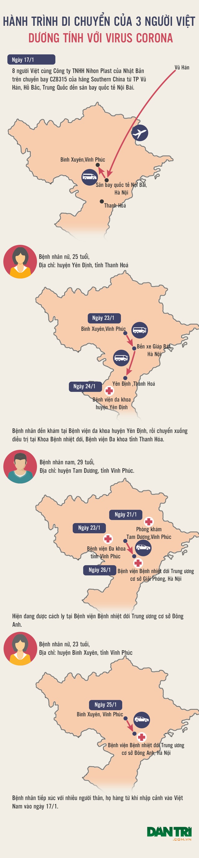 Cả 4 bệnh nhân đều có chung tiền sử dịch tễ, họ cùng với 4 người Việt Nam khác được Công ty TNHH Nihon Plast của Nhật Bản cử sang Trung Quốc tập huấn tại thành phố Vũ Hán, tỉnh Hồ Bắc cách đây 02 tháng. Cả 3 bệnh nhân cùng trở về Việt Nam ngày 17/01/2020 trên cùng chuyến bay CZ8315 của hãng Southern China.