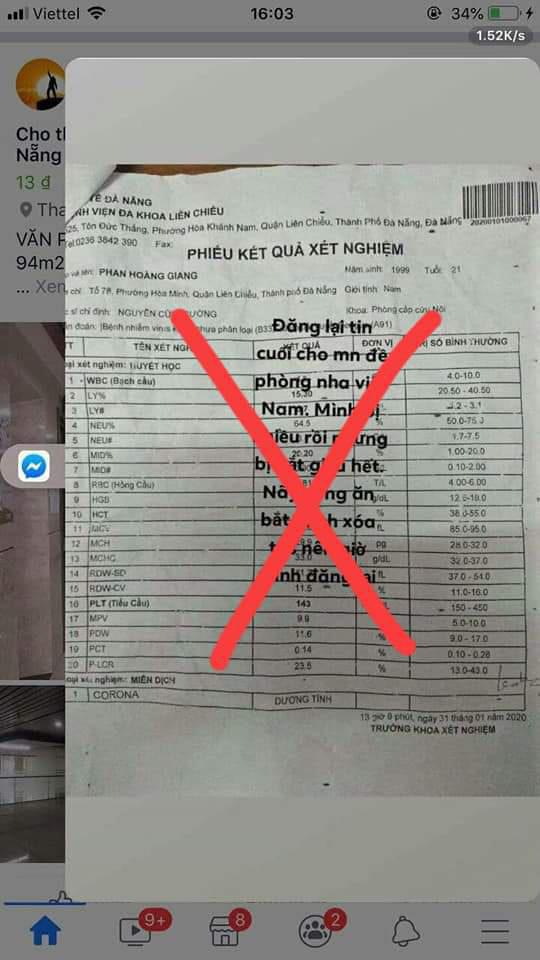 Trước đó, ngày 31-1, G. đã sử dụng tài khoản Facebook cá nhân đăng tải hình ảnh kèm nội dung liên quan một bản kết quả xét nghiệm dương tính với virus Corona của Trung tâm Y tế quận Liên Chiểu.