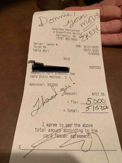 Và dĩ nhiên, trong tâm trí của mình cô nghĩ mình nhận được 50 USD tiền boa – một số tiền không nhỏ so với giá trị bữa ăn.