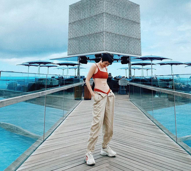 Với lợi thế vòng eo săn chắc, phẳng lỳ, Bảo Anh tự tin diện phong cách đi biển độc lạ.