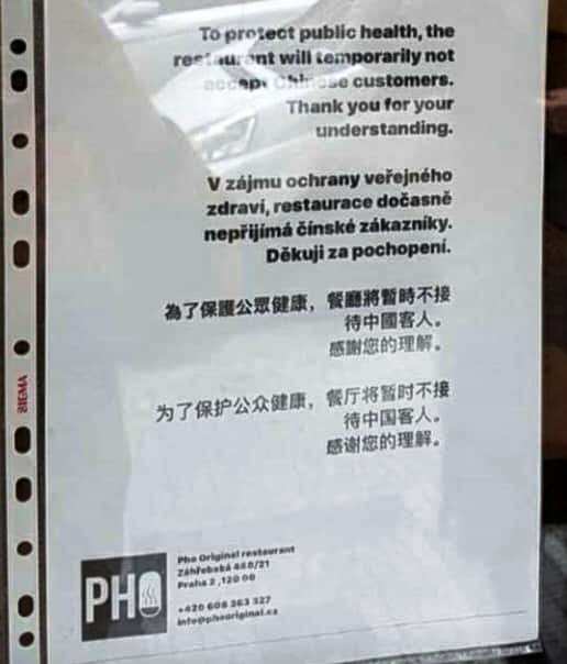 Một tiệm phở Việt bị trách vì kỳ thị người Tàu. Bên ngoài tiệm Pho Original Restaurant tại thủ đô Prague, Czech ngày 4 tháng Hai, 2020 là tờ thông báo. Thông báo này viết tiếng Anh, tiếng Czech, và tiếng Trung Hoa với nội dung không nhận khách hàng Trung Hoa vì lý do “bảo vệ sức khỏe cộng đồng”.