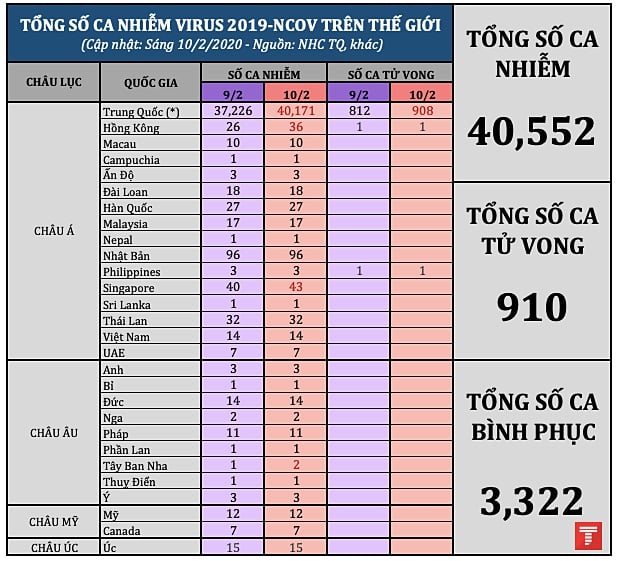 Cập nhật diễn biến dịch viêm phổi Vũ Hán (sáng 10/2). Thông tin từ UB Y tế Nhà nước Trung Quố, cho đến 7h30 sáng ngày 10/2 số ca nhiễm bệnh tăng lên 40.171 ca toàn quốc; số ca tử vong tăng kỷ lục thêm 96 ca, lên 908 người toàn quốc.