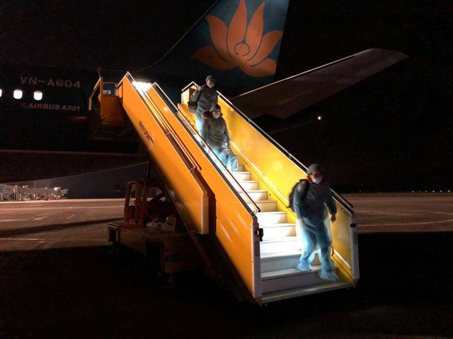 Chuyến bay HVN68 của Vietnam Airlines chở 29 người Việt từ Vũ Hán đáp xuống sân bay quốc tế Vân Đồn (Quảng Ninh) lúc 5h04.