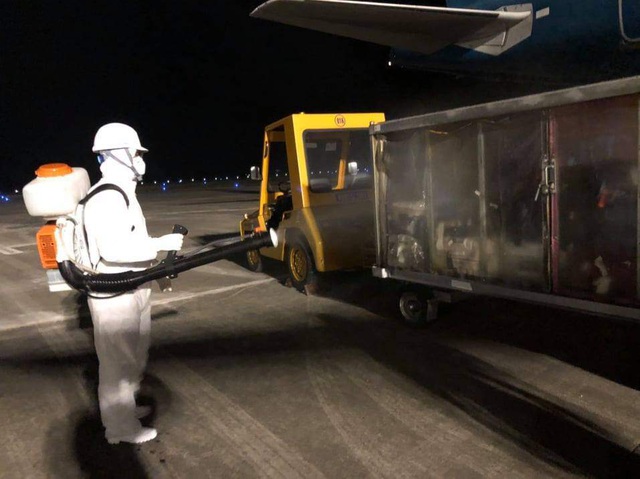 Máy bay và các xe chuyên dụng phục vụ chuyến bay được phun khử trùng, cách ly lúc sáng sớm nay