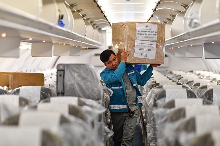 Vận chuyển hàng cứu trợ lên chuyến bay đón công dân Việt từ Vũ Hán về nước. Ảnh: VNA.