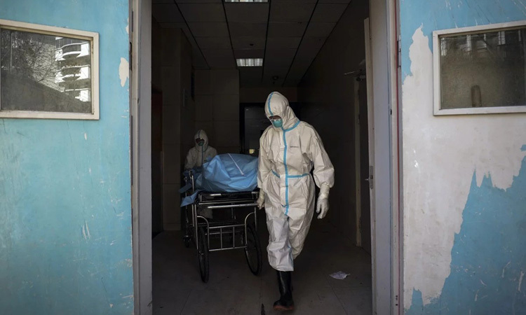 Nhân viên y tế di chuyển thi thể một bệnh nhân tử vong vì virus corona tại bệnh viện ở Vũ Hán hôm 16/2. Ảnh: AP.