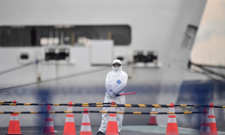 Một quan chức mặc đồ bảo hộ gần du thuyền Diamond Princess ở cảng Yokohama hôm 20/2. Ảnh: AP.