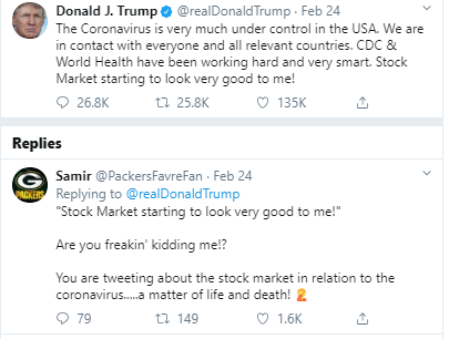 dow jones 879 .. Nasdaq 255 ..sao kỳ này không thấy cụ dump lấy điểm về mình hén . tui nhớ truớc đây cụ dump nói nếu dân không bầu cho tui thì stock sẽ xuống .. nhưng hôm nay vì một con vi-rút mà cả nuớc mỹ phải chao đão . vậy cụ dump thuộc loại gì đây .. chắc là vi-rút hả . quá buồn cho dân mỹ ..