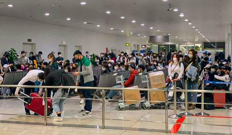 Số hành khách từ Hàn Quốc về Việt Nam tối 27/2 ngồi chờ tại tầng 2 để kiểm soát y tế. Ảnh: Giang Kim Bùi