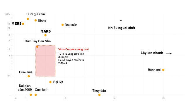 Tỷ lệ tử vong và hệ số lây nhiễm của các dịch bệnh lớn. Ảnh: NY Times