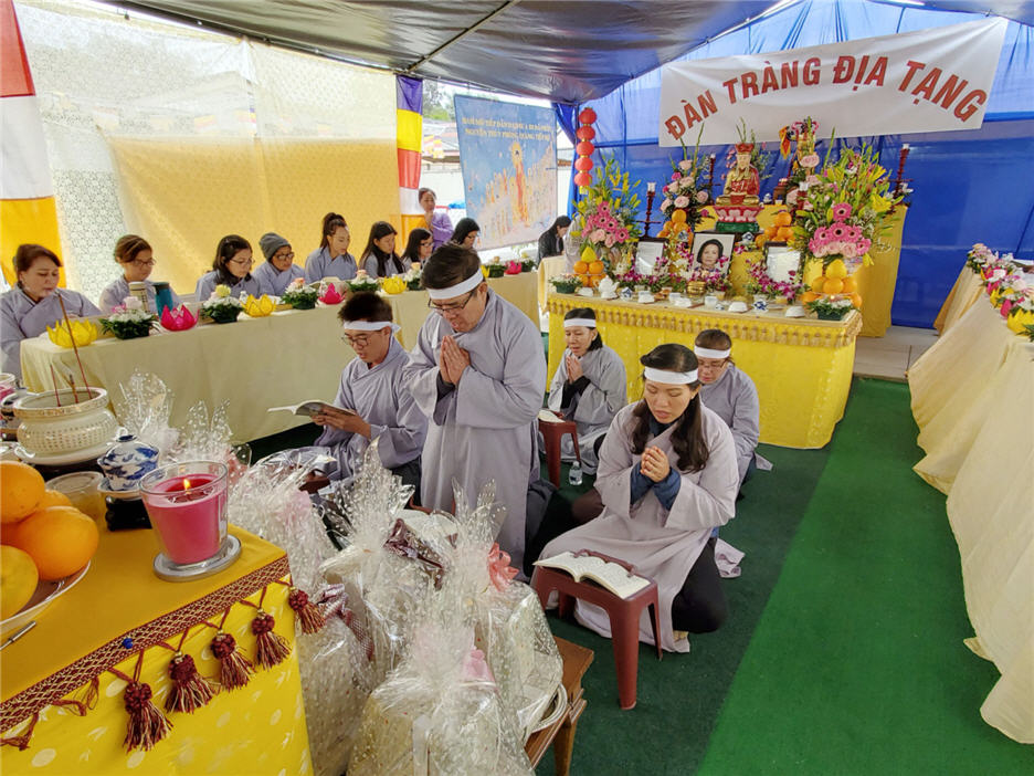 Những đứa con không trông đợi một ngày chít lên đầu những vành tang trắng một cách đột ngột, bởi hai chữ “vô thường.” (Hình: Ngọc Lan/Người Việt)